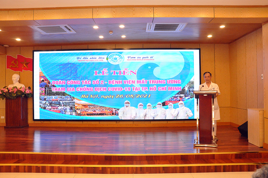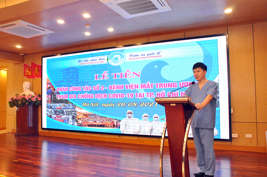Phát biểu tại lễ tiễn đoàn công tác đặc biệt đợt 2 của Bệnh viện Mắt TW, PGS. TS Nguyễn Xuân Hiệp, Bí thư Đảng uỷ, Giám đốc Bệnh viện Mắt TW xúc động và khâm phục tinh thần sẵn sàng chia sẻ khó khăn đi vào nơi tâm dịch của các thành viên đoàn công tác nói riêng và sự ủng hộ, đoàn kết của toàn thể cán bộ, nhân viên Bệnh viện Mắt TW nói chung. PGS.TS Nguyễn Xuân Hiệp đã ân cần dặn dò, giao nhiệm vụ Đoàn công tác đặc biệt đợt 2 vào phối hợp và sát cánh cùng Đoàn công tác đợt 1, hoàn thành tốt các nhiệm vụ được giao cũng như động viên, đoàn kết chia sẻ nơi tuyến đầu chống dịch.