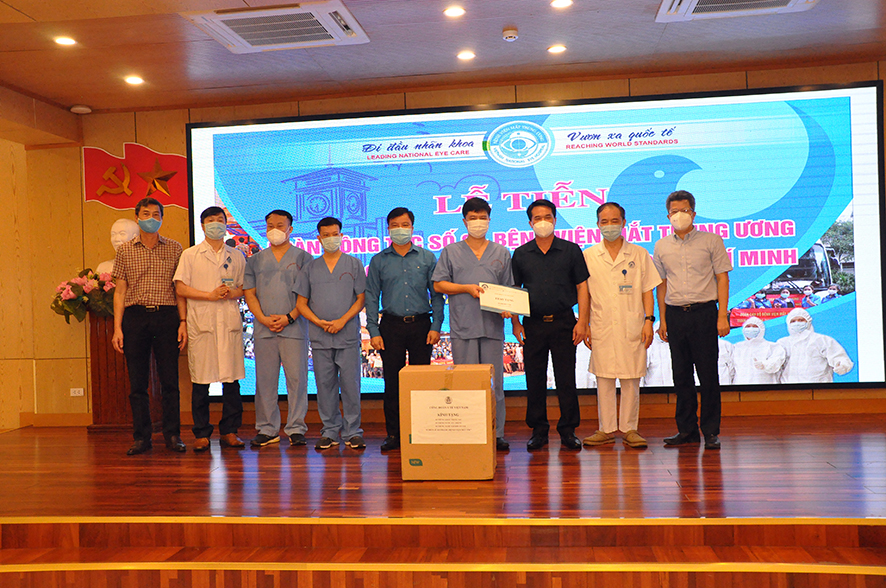 Phó Chủ tịch Công đoàn Y tế Việt Nam Vũ Tiến Dũng tới dự Lễ tiễn và trao quà cho các thành viên trong Đoàn công tác, chia sẻ, cảm kích trước tinh thần tình nguyện và quyết tâm rất cao của Đoàn cùng sự chỉ đạo sát sao, quan tâm chu đáo của lãnh đạo Bệnh viện Mắt TW với các phương án và nhiệm vụ cụ thể trong việc tăng cường nhân lực y bác sỹ vào Nam chống dịch. Phía Công đoàn Y tế Việt Nam nỗ lực vận động, tạo điều kiện thuận lợi cùng các chính sách y tế để các Đoàn công tác chi viện cho các tỉnh phía Nam chống dịch an tâm công tác nơi tuyến đầu…