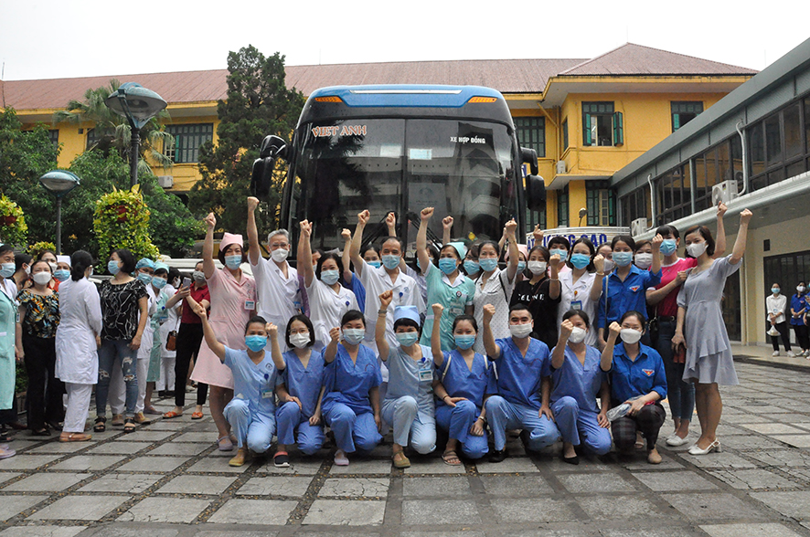 Điều dưỡng Đỗ Thu Hồng (khoa Mắt Trẻ em) trong giờ phút quyến luyến chia tay đồng nghiệp chia sẻ: Chúng tôi đã sẵn sàng lên đường và chuẩn bị, trang bị kỹ lưỡng từ nhiều ngày qua, để vào “chia lửa” với các đồng nghiệp và người bệnh Covid. Chúng tôi tự tin sẽ chiến thắng Covid và bình an trở về…