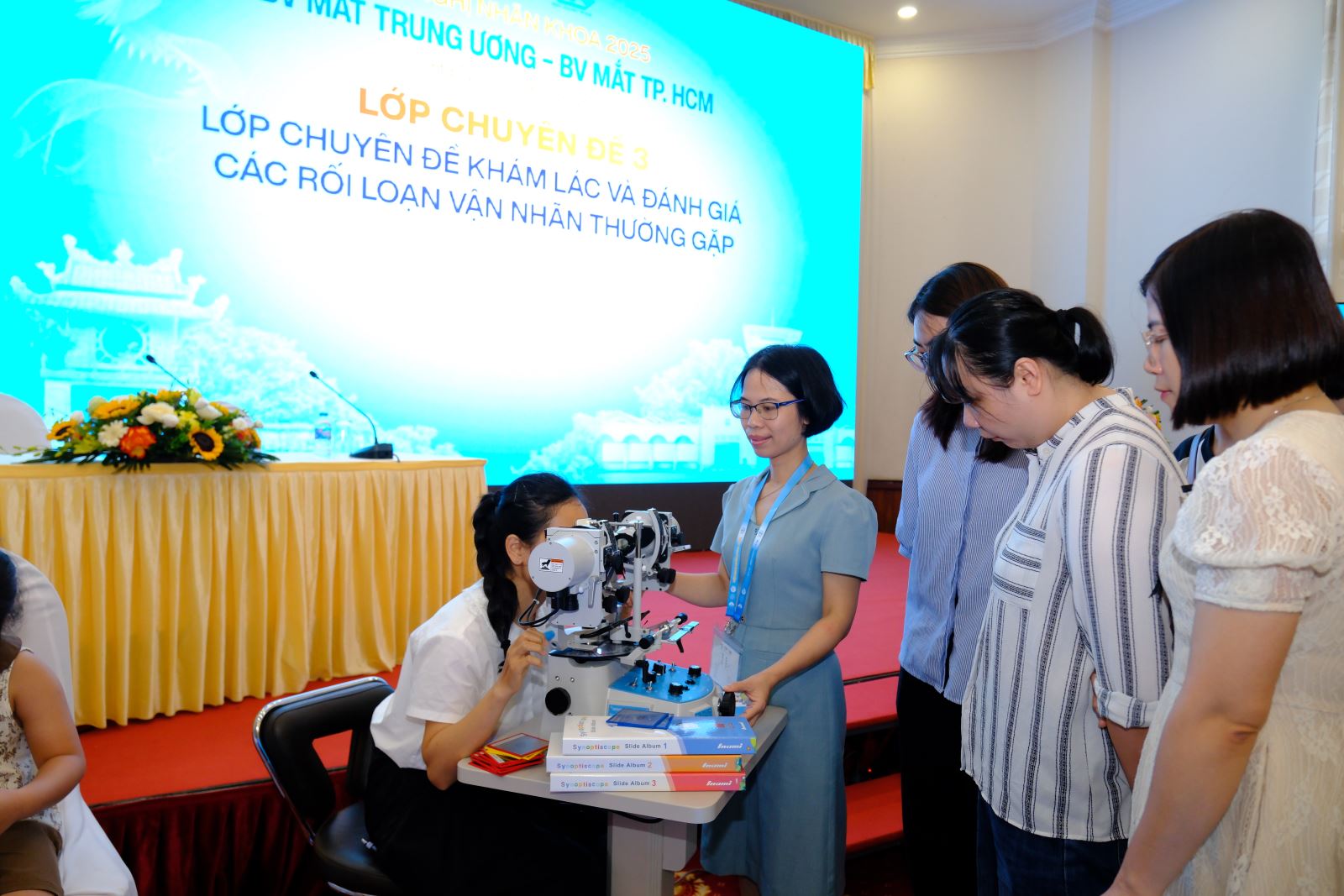 Trong chương trình Hội nghị Nhãn khoa 2025,Bệnh viện Mắt Trung ương đã tổ chức cập nhật kiến thức nhãn khoa mới thông qua các khóa học, đào tạochuyên đề thuộc các lĩnh vực:  Mắt trẻ em; Glôcôm; Chẩn đoán hình ảnh, xét nghiệm và các vấn đề liên quan giác mạc (bản đồ giác mạc) cho gần 100học viên là các bác sỹ, kỹ thuật viên, điều dưỡng chuyên ngành Nhãn khoa.