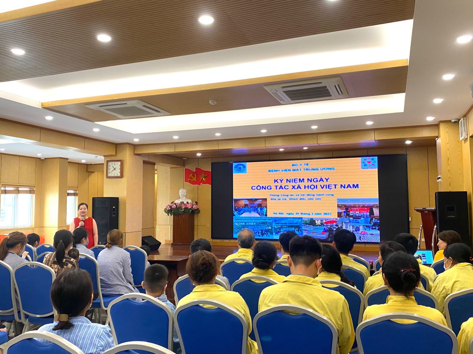 Hưởng ứng sự chỉ đạo của Bộ Y tế theo công văn số 1107/BYT-TCCB ngày 06/3/2023, Phòng Công tác xã hội của Bệnh viện Mắt TW đã triển khai chùm hoạt động để chào mừng ngày Công tác xã hội Việt Nam 25/3/2023 tại Bệnh viện Mắt Trung ương. Phòng đã tổ chức viết bài đăng tin truyền thông đến người bệnh, người nhà người bệnh, nhân viên y tế để biết về ý nghĩa của nghề công tác xã hội. Phòng cũng chủ động liên hệ, kết nối với nhiều nhóm nhà tài trợ nhằm lan tỏa tình yêu thương, đề cao sự sẻ chia, nhân lên tinh thần tương thân tương ái, lẽ sống lá lành đùm lá rách đến được với nhiều người bệnh, người yếu thế nhất có thể.