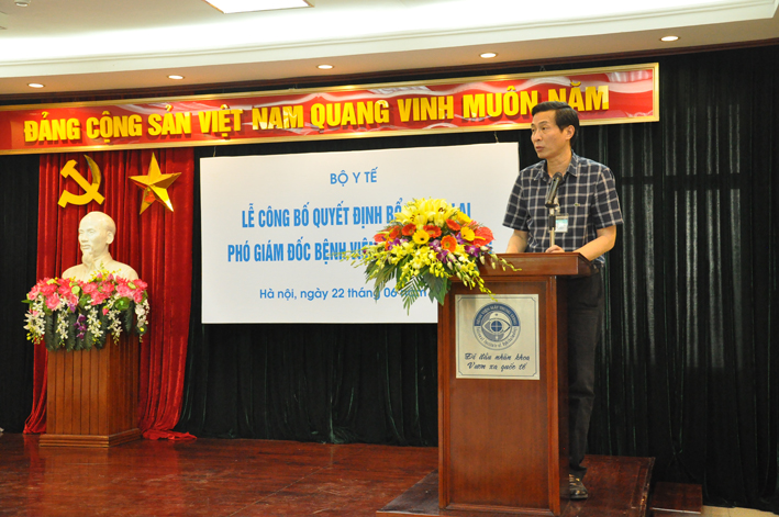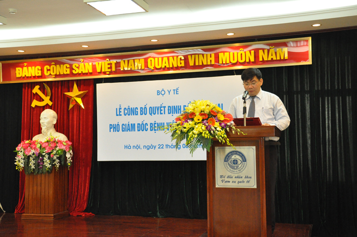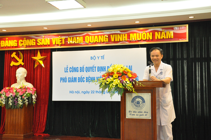 Thay mặt Ban Cán sự Đảng, Lãnh đạo Bộ Y tế GS.TS. Nguyễn Viết Tiến - Thứ trưởng Bộ Y tế đã trao quyết định cho PGS.TS. Cung Hồng Sơn và Ths. Nguyễn Đức Thành. Phát biểu tại lễ trao, Thứ trưởng Nguyễn Viết Tiến chúc mừng bệnh viện và cá nhân 2 phó giám đốc Cung Hồng Sơn và Nguyễn Đức Thànhđã đạt được sự tín nhiệm cao trong tập thể bệnh viện và chúc 2 đồng chí hoàn thành tốt nhiệm vụ được giao trong nhiệm kỳ mới. Đồng thời Thứ trưởng mong muốn Ban lãnh đạo cần nêu cao tinh thần đoàn kết, thống nhất, nâng cao năng lực, tinh thần trách nhiệm, lãnh đạo, chỉ đạo tập thể bệnh viện phấn đấu hoàn thành xuất sắc nhiệm vụ được Bộ Y tế giao, xứng đáng với bề dày truyền thống của một đơn vị anh hùng.