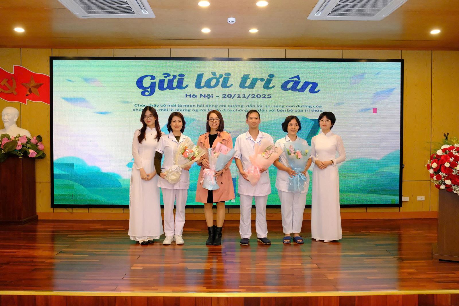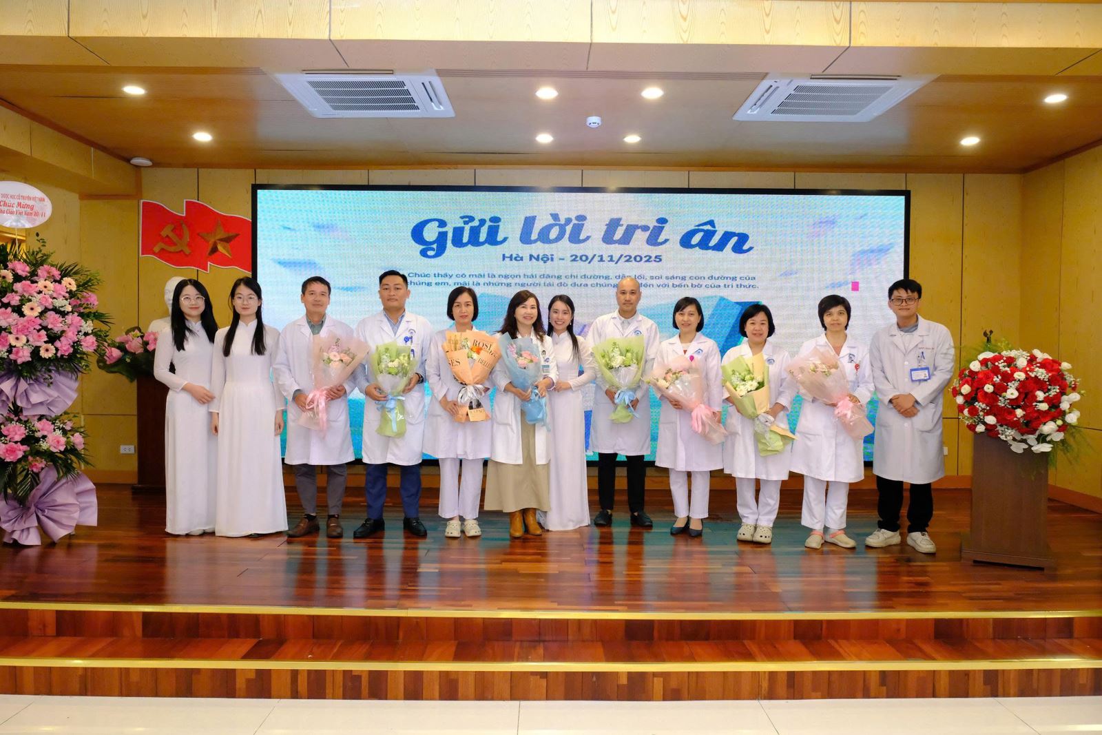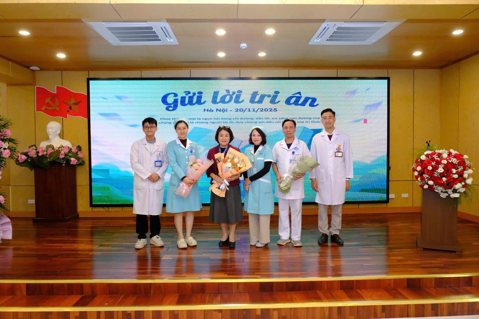 Trong không khí trang trọng và ấm áp, những lời ca tiếng hát cùng những bó hoa tươi thắm được các em gửi tới các thầy cô – là những y bác sĩ nhãn khoa trực tiếp hướng dẫn, kèm cặp sinh viên trong quá trình học tập và thực hành lâm sàng tại bệnh viện. Đây là dịp để các em bày tỏ lòng biết ơn đối với những người thầy thầm lặng, tận tụy trong sự nghiệp đào tạo nguồn nhân lực y khoa chất lượng cao.