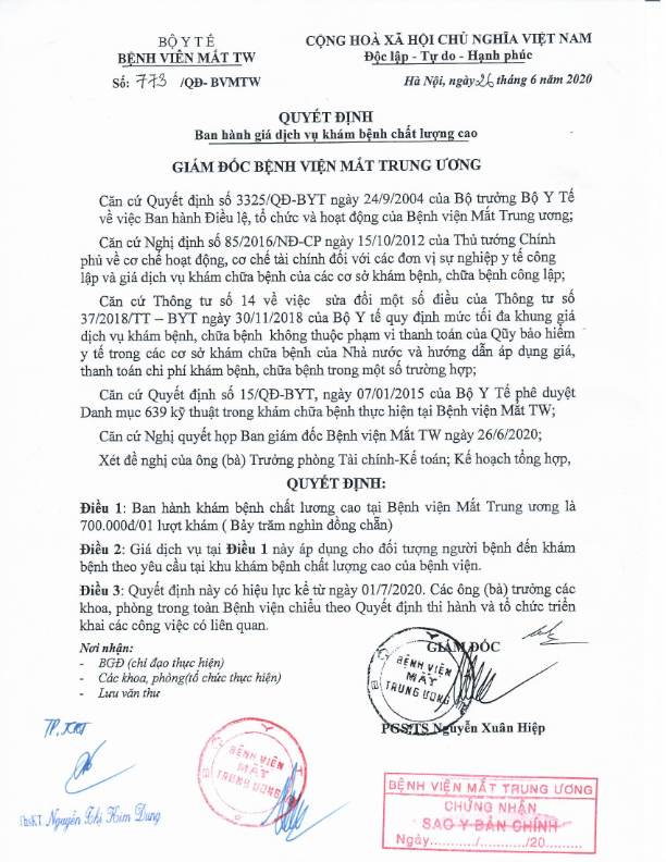 Quyết định ban hành giá dịch vụ Laser femtosecond điều trị tật khúc xạ