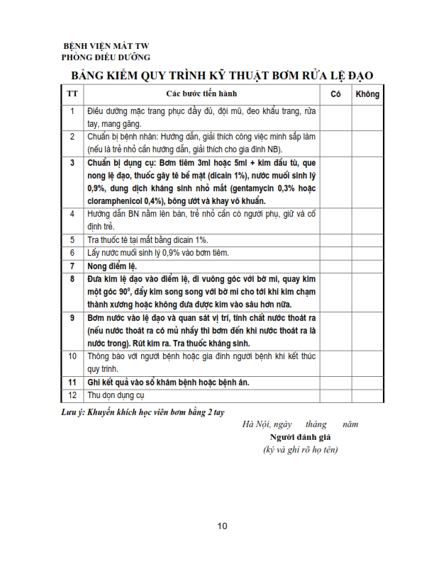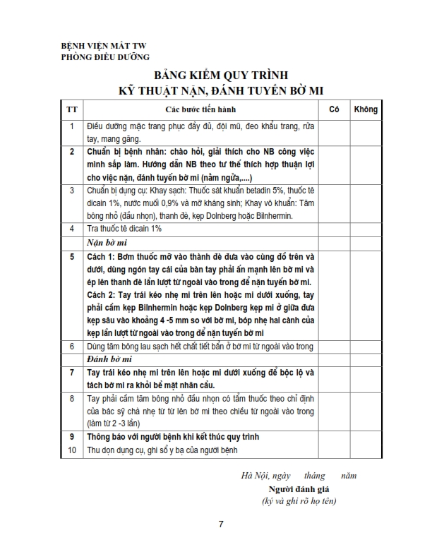 Bảng kiểm quy trình kỹ thuật chích chắp, lẹo, đốt lông xiêu, khâu kết mạc, rửa bỏng, khâu da mi, lấy di vật kết giác mạc nông, nặn tuyến bờ mi .....