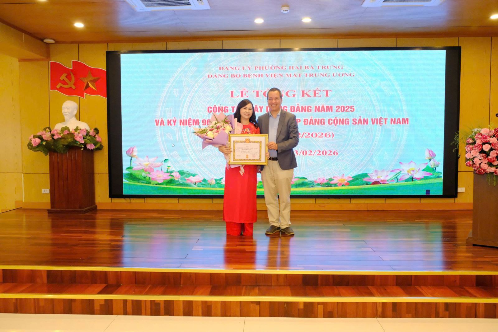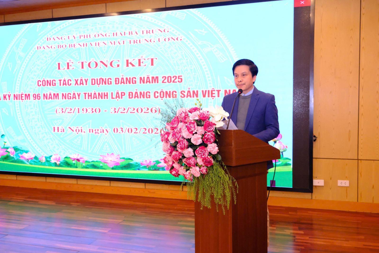 Phát biểu tại Hội nghị, thay mặt Ban Thường vụ Đảng ủy phường Hai Bà Trưng, đồng chí Nguyễn Thị Minh Hà ghi nhận và chúc mừng những kết quả, thành tích nổi bật mà Đảng bộ Bệnh viện Mắt Trung ương đã đạt được trong năm 2025, đặc biệt là việc bệnh viện là một trong năm tổ chức cơ sở Đảng tiêu biểu được khen thưởng về công tác phát triển đảng viên. Đồng chí đánh giá cao nỗ lực của Đảng bộ bệnh viện trong việc vượt qua khó khăn, tổ chức thành công Đại hội nhiệm kỳ 2025–2030, từng bước kiện toàn tổ chức, củng cố khối đoàn kết thống nhất, nâng cao năng lực lãnh đạo và sức chiến đấu của Đảng bộ. Với vai trò là người trực tiếp theo dõi chỉ đạo, đồng chí Nguyễn Thị Minh Hà cũng ghi nhận sự bài bản, nghiêm túc trong điều hành, tổ chức hoạt động công tác Đảng của bệnh viện, qua đó tin tưởng trong nhiệm kỳ mới BCH Đảng bộ bệnh viện sẽ có nhiều đổi mới, bứt phá trong công tác lãnh đạo, chỉ đạo đưa bệnh viện ngày càng phát triển, khởi sắc.