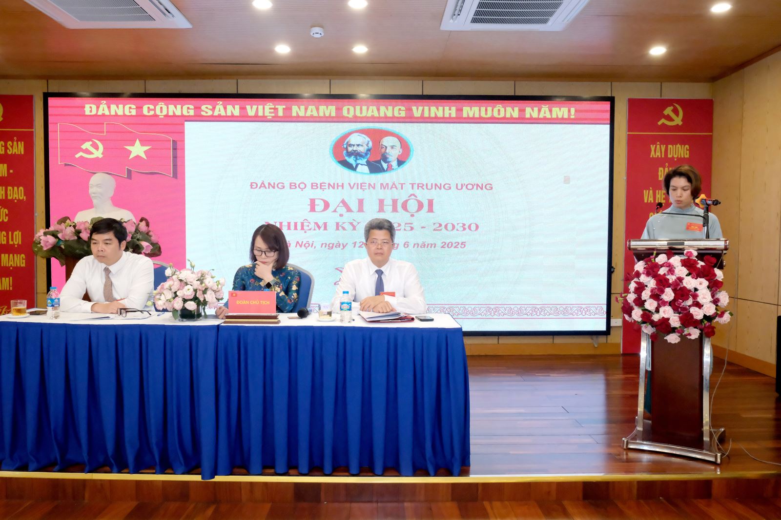 Đồng chí Trần Trung Kiên thay mặt Đoàn thư ký lên trình bày dự thảo Nghị quyết Đại hội Đảng bộ Bệnh viện Mắt Trung ương nhiệm kỳ 2025 – 2030 với số Đảng viên tán thành là 130 Đảng viên chính thức .