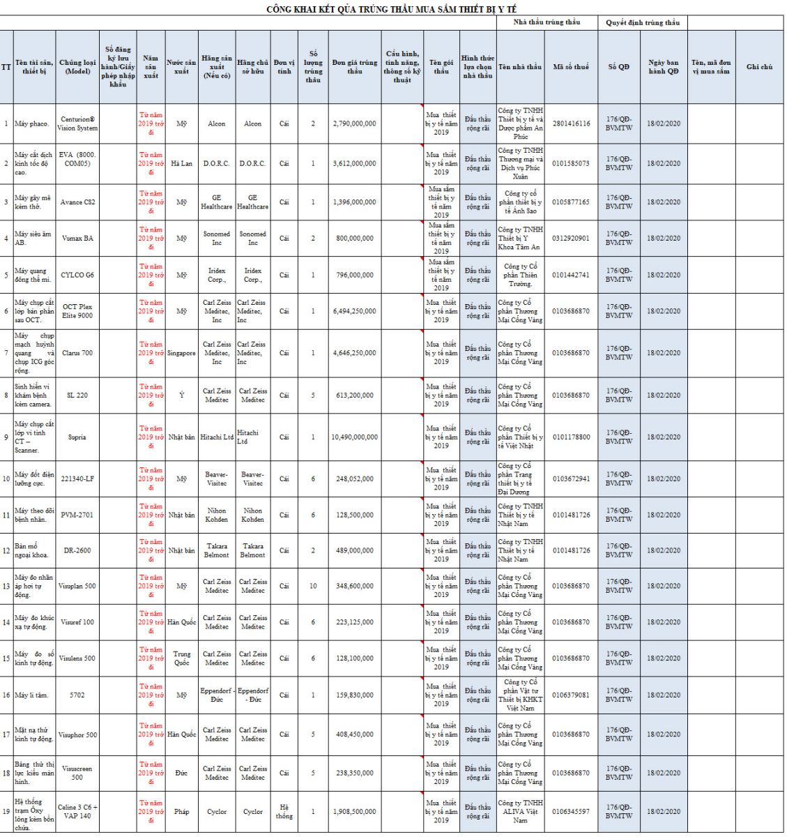 Bệnh viện Mắt TW - Công khai kết quả đầu thầu mua sắm thiết bị Y tế năm 2020