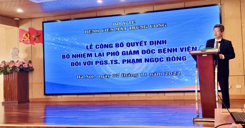Theo đó, tại Quyết định số 2960/QĐ/BYT ngày 31/10/2022 của Bộ trưởng Bộ Y tế quyết định bổ nhiệm lại Phó Giám đốc phụ trách chuyên môn Bệnh viện Mắt Trung ương đối với PGS.TS.Phạm Ngọc Đông. Quyết định có hiệu lực 05 năm kể từ ngày quyết định có hiệu lực.