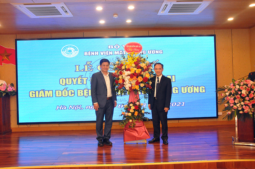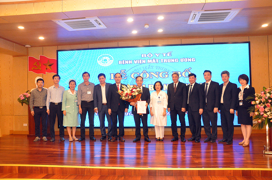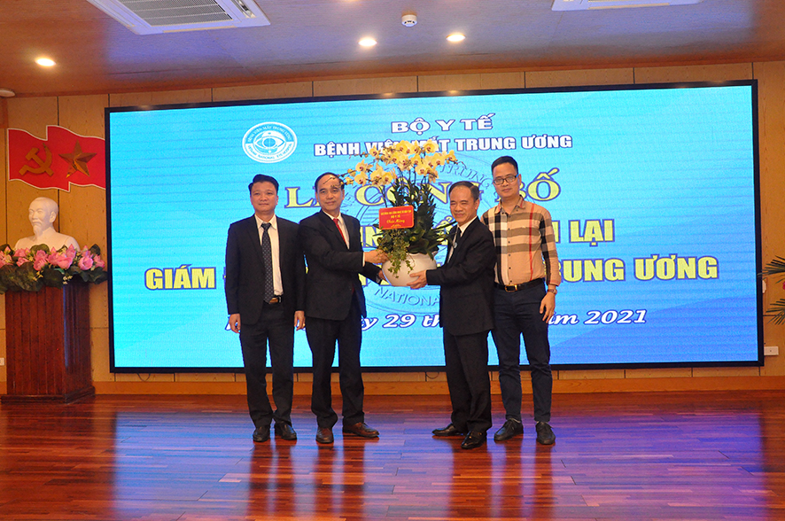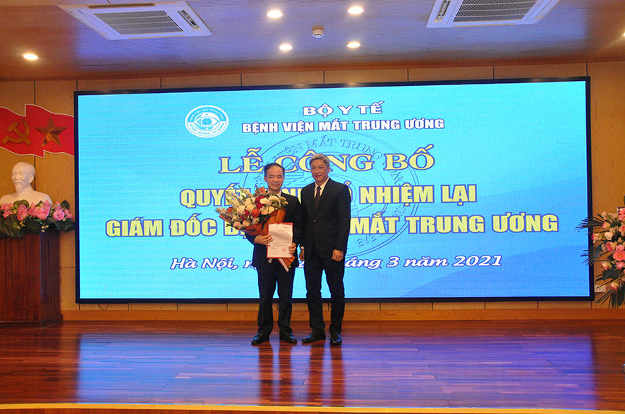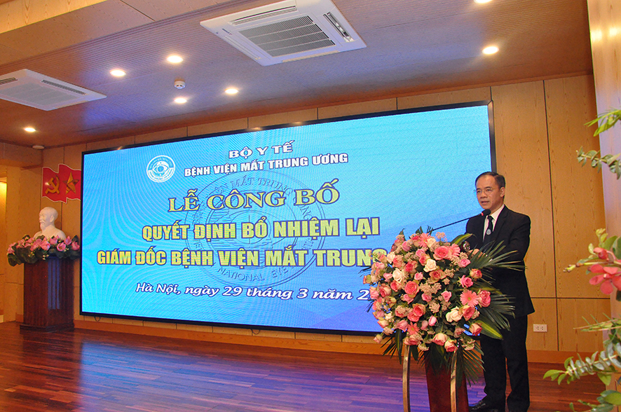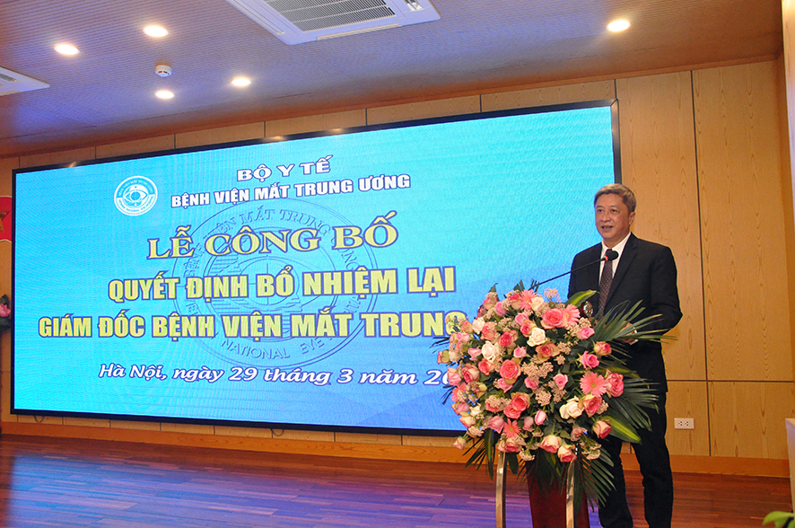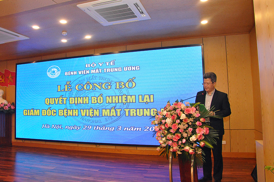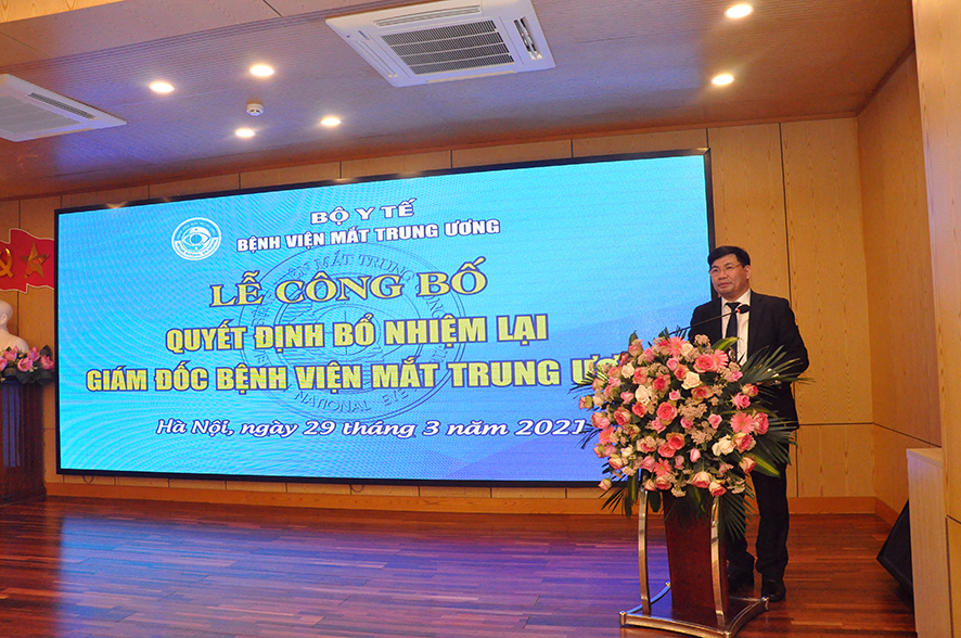 Tại buổi Lễ, được sự ủy quyền của Bộ trưởng Bộ Y tế, BS. Nguyễn Hồng Sơn - Vụ trưởng Vụ Tổ chức cán Bộ đã công bố Quyết định số 1666QĐ/BYT ngày 24/03/2021 của Bộ trưởng Bộ Y tế quyết định bổ nhiệm lại Giám đốc Bệnh viện Mắt Trung ương đối với PGS.TS. Nguyễn Xuân Hiệp. Quyết định có hiệu lực 05 năm kể từ ngày ký ban hành.