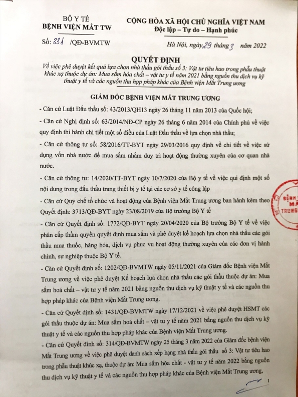 Gói số 1: Hóa chất - vật tư phù hợp theo máy thuốc dự án: Mua sắm hóa chất - vật tư y tế năm 2021 bằng nguồn thu kỹ thuật y tế và các nguồn thu hợp pháp khác của Bệnh viện Mắt Trung ương