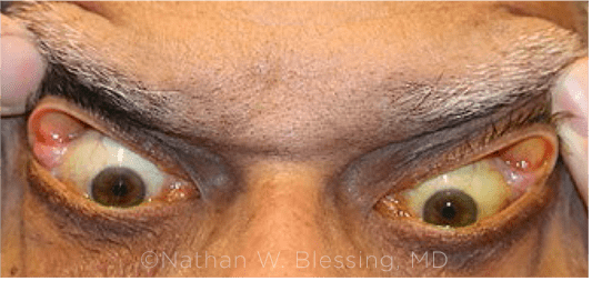 Hội chứng nhẽo mi: mi trên dễ dàng bị lộn ra chỉ bằng động tác kéo căng góc ngoài nhẹ nhàng