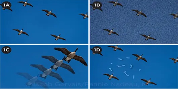 Mô phỏng: (1A) bình thường (1B) tuyết thị giác, mô tả nền hình ảnh là những chấm nhỏ màu xám, nhấp nháy (điểm ảnh hóa); (1C) palinopsia - hiện tượng lưu ảnh: sự tồn tại của hình ảnh sau khi kích thích thị giác không còn nữa; và (1D) hiện tượng entoptic - chấm chuyển động nhỏ trên nền xanh: nhận thức thị giác phát sinh từ các nguồn bên trong mắt chứ không phải từ thế giời bên ngoài (bong dịch kính, vẩn đục dịch kính, phát sáng do dụi mắt, thấy vật thể trôi nổi)