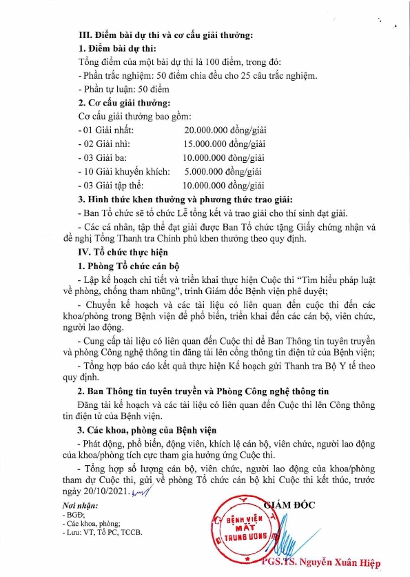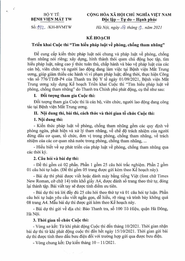Để cung cấp kiến thức pháp luật nói chung và pháp luật về phóng, chống tham nhũng nói riêng; xây dựng, hình thành thói quen chủ động học tập, tìm hiểu pháp luật, nâng cao ý thức tuân thủ, chấp hành và bảo vệ pháp luật của các cán bộ, viên chức và người lao động đang làm việc tại Bệnh viện Mắt Trung ương, giúp giảm thiểu các hành vi vi phạm pháp luật; đồng thời, thực hiện Công văn số 776/TTrB-P4 của Thanh tra Bộ Y tế ngày 01/09/2021, Bệnh viện Mắt Trung ương xây dựng Kế hoạch Triển khai Cuộc thi “Tìm hiểu pháp luật về phòng, chống tham nhũng” do Thanh tra Chính phủ phát động.