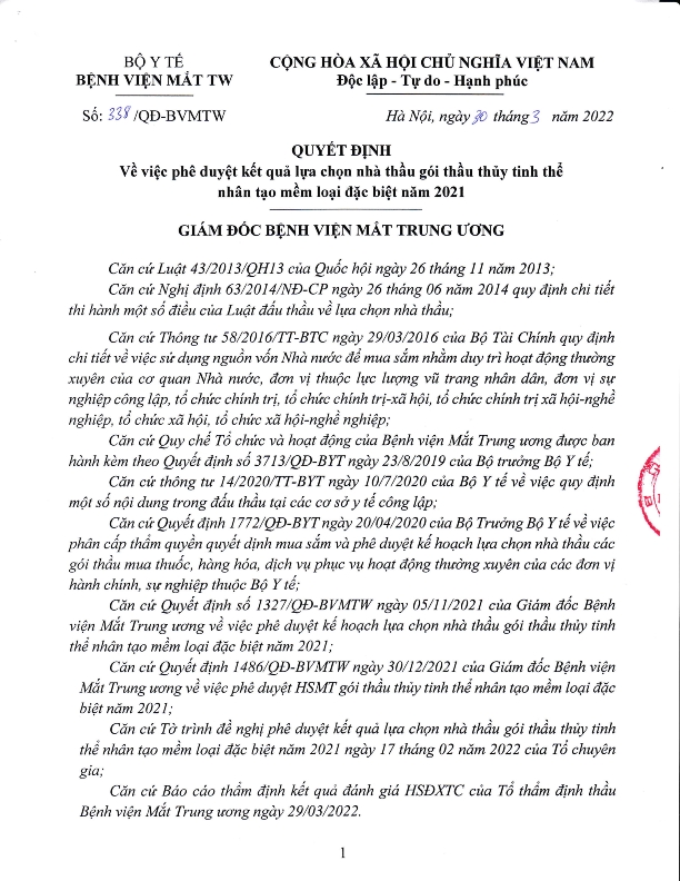Kết quả lựa chọn nhà thầu gói thầu thủy tinh thể nhân tạo mềm loại đặc biệt năm 2021