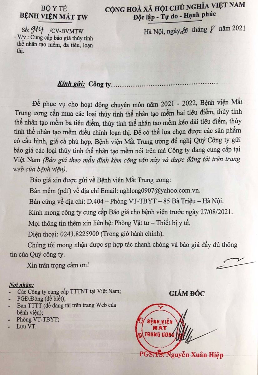 Để phục vụ cho hoạt động chuyên môn năm 2021-2022, Bệnh viện Mắt TW cần mua các loại thủy tinh thể nhân tạo mềm hai tiêu điểm, thủy tinh thể nhân tạo mềm ba tiêu điểm ....