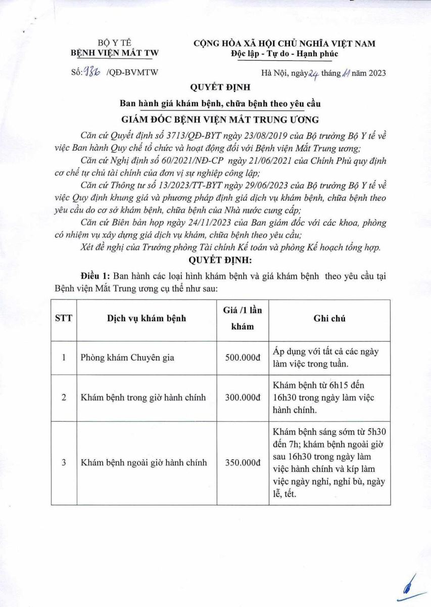Quyết định ban hành giá khám bệnh, chưa bệnh theo yêu cầu