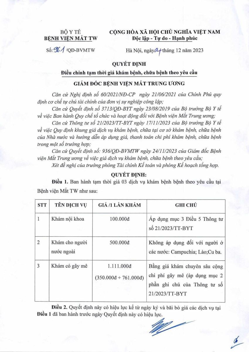Quyết định điều chỉnh tạm thời giá khám bệnh, chữa bệnh theo yêu cầu