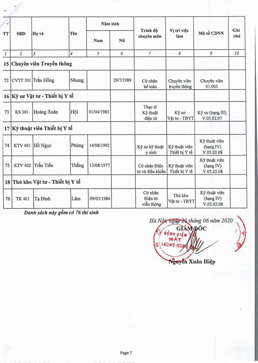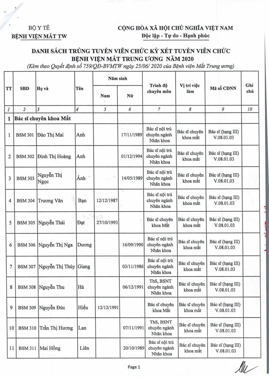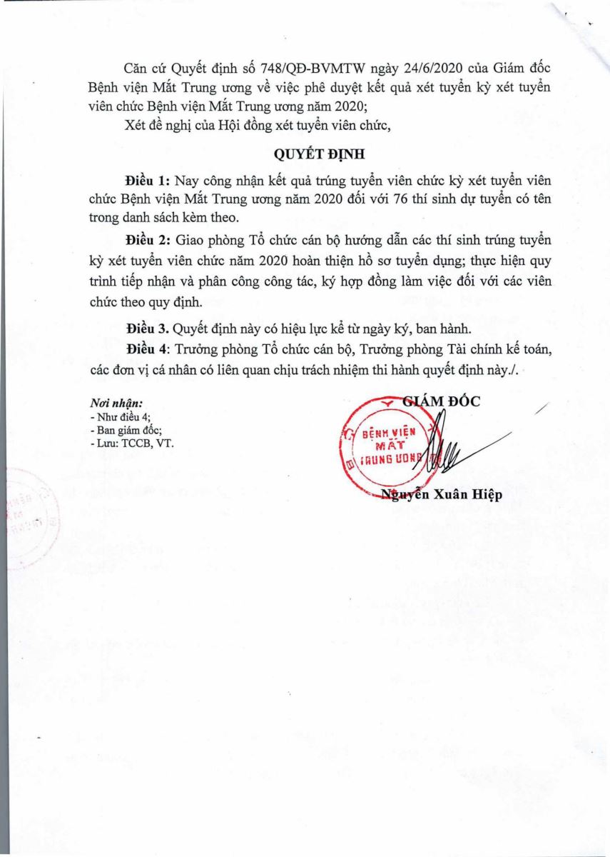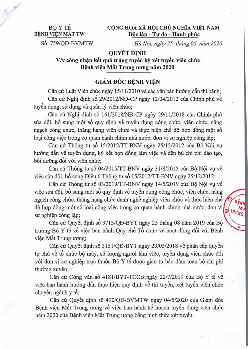 Quyết định - Về việc công nhận kết quả trúng tuyển kỳ xét tuyển viên chức Bệnh viện Mắt Trung ương 2020.