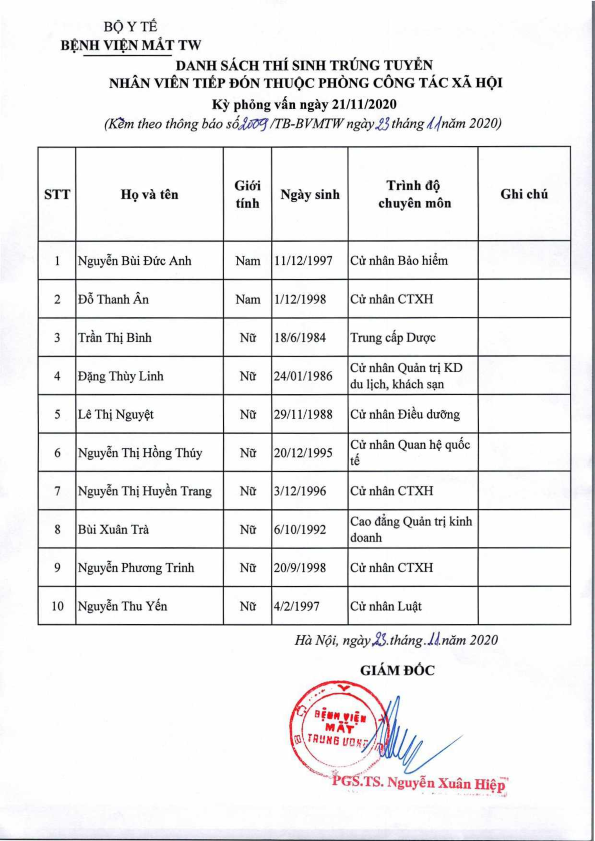 Thông báo - Kết quả trúng tuyển và hoàn thiện hồ sơ đối với thí sinh trúng tuyển kỳ xét tuyển viên chức năm 2020 của Bệnh viện Mắt Trung ương.