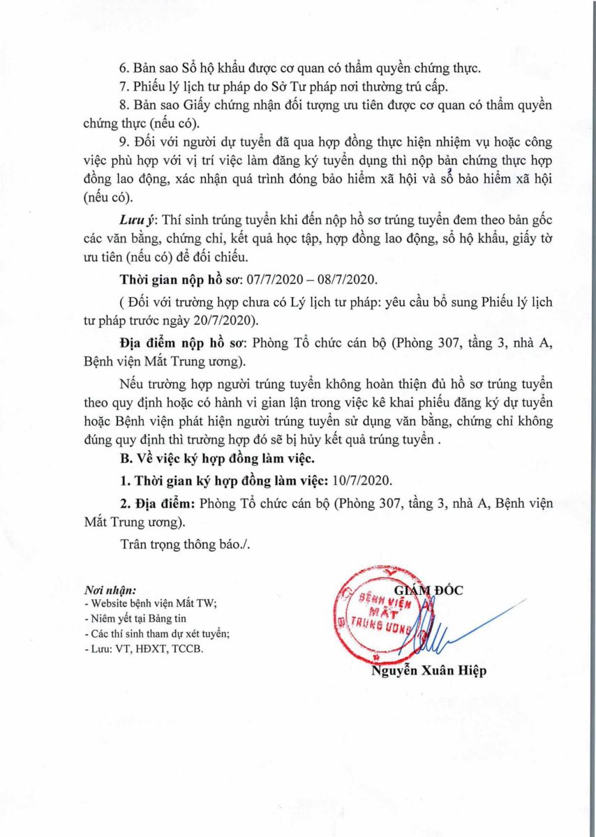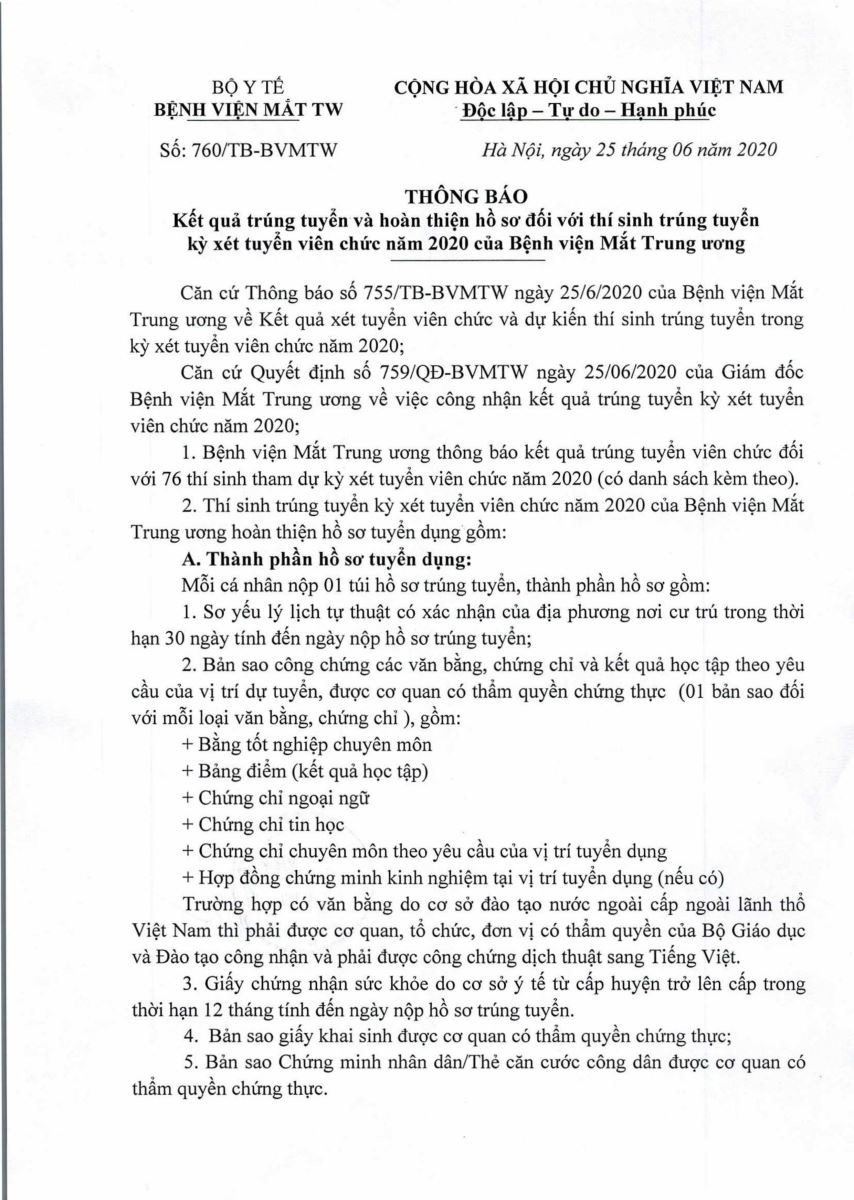 Thông báo - Kết quả trúng tuyển và hoàn thiện hồ sơ đối với thí sinh trúng tuyển kỳ xét tuyển viên chức năm 2020 của Bệnh viện Mắt Trung ương.