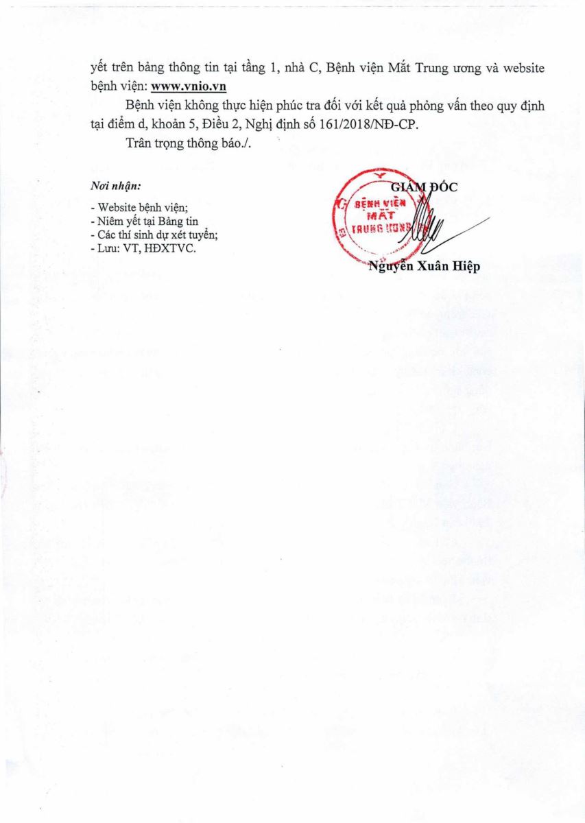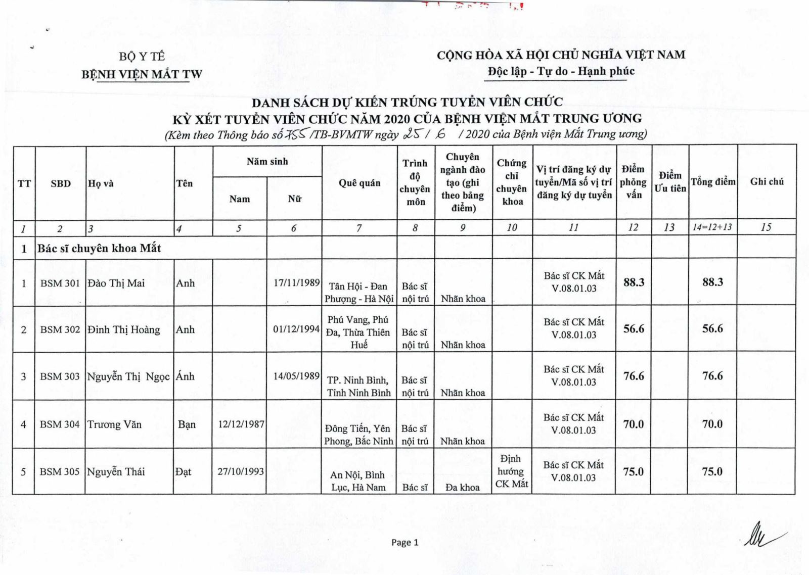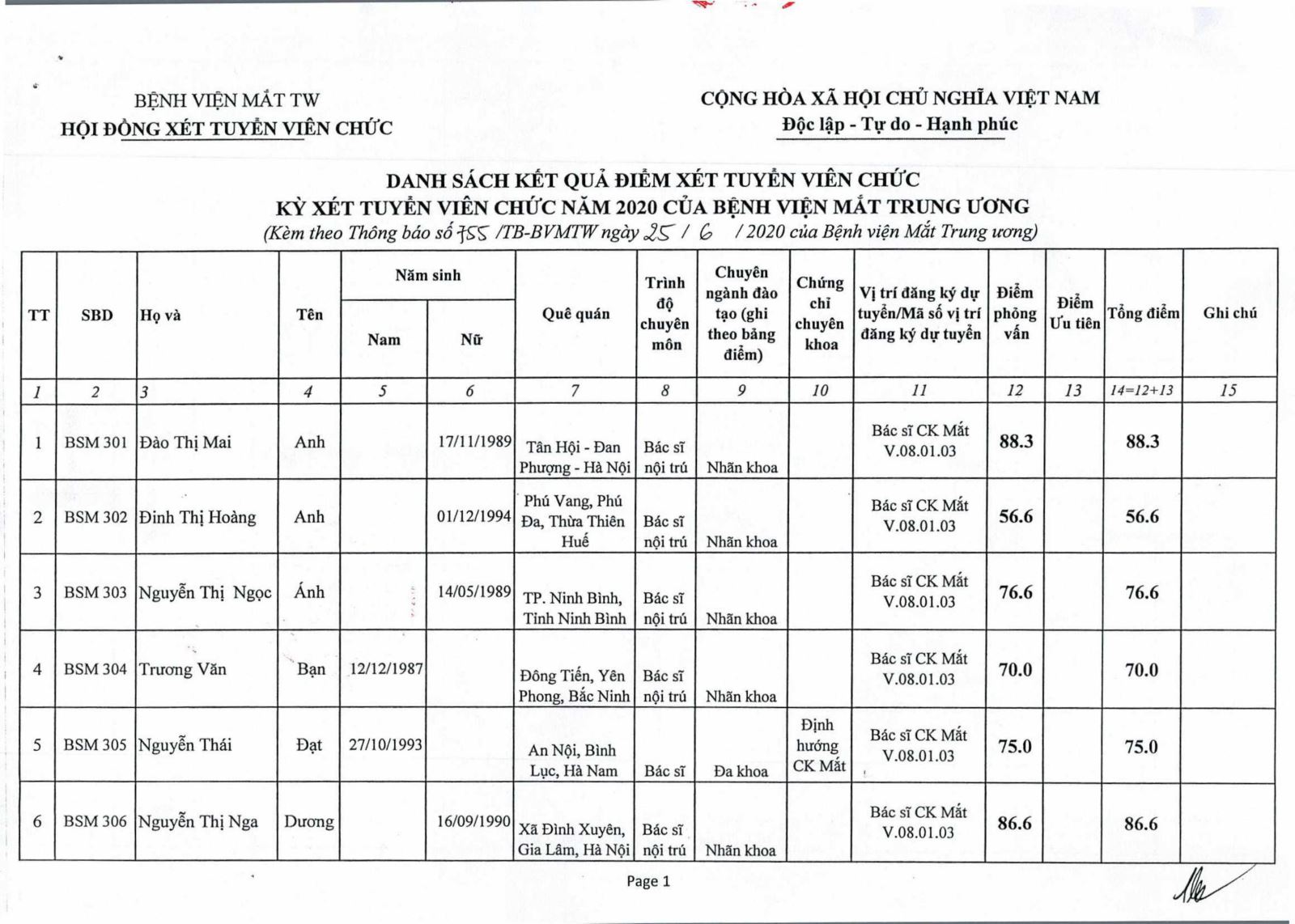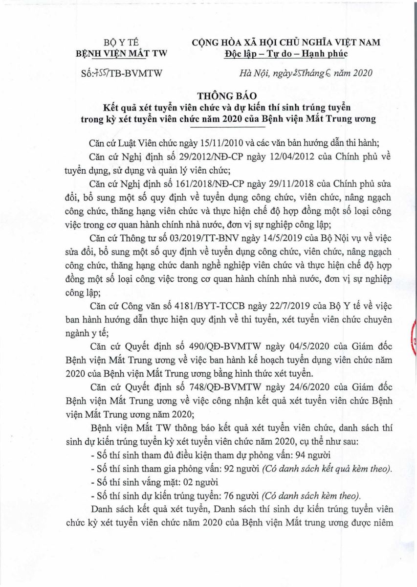 Thông báo - Kết quả xét tuyển viên chức và dự kiến thí sinh trúng tuyển trong kỳ xét tuyển viên chức năm 2020 của Bệnh viện Mắt Trung ương