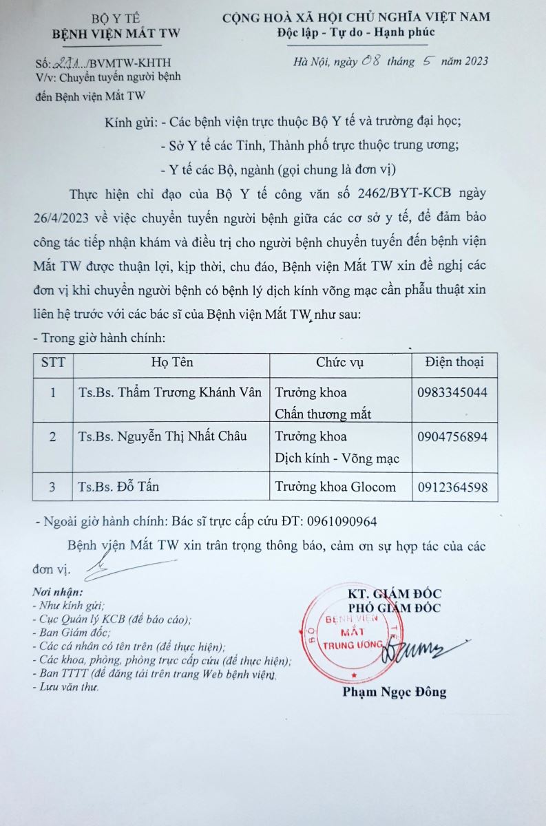 Thực hiện chỉ đạo của Bộ Y tế công văn số 2462/BYT-KCB ngày 26/4/2023 về việc chuyển tuyến người bệnh giữa các cơ sở y tế, để đảm bảo công tác tiếp nhận khám và điều trị cho người bệnh chuyển tuyến đến bệnh viện Mắt Trung ương được thuận lợi, kịp thời, chu đáo, Bệnh viện Mắt Trung ương xin đề nghị các đơn vị khi chuyển người bệnh có bệnh lý dịch kính võng mạc cần phẫu thuật xin liên hệ trước với các bác sĩ của bệnh viện Mắt Trung ương như sau: