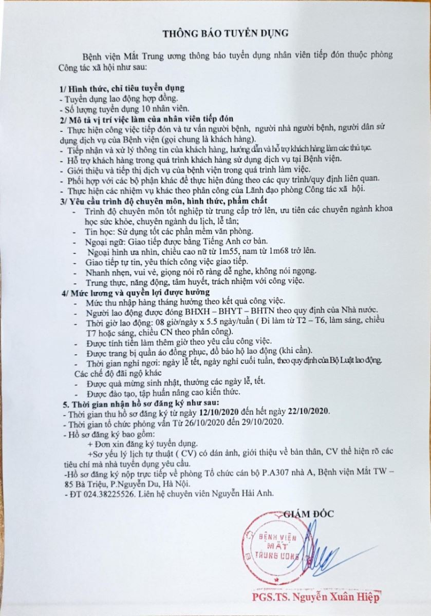 Bệnh viện Mắt trung ương tuyển dụng nhân viên Tiếp đón thuộc phòng Công tác xã hội như sau: